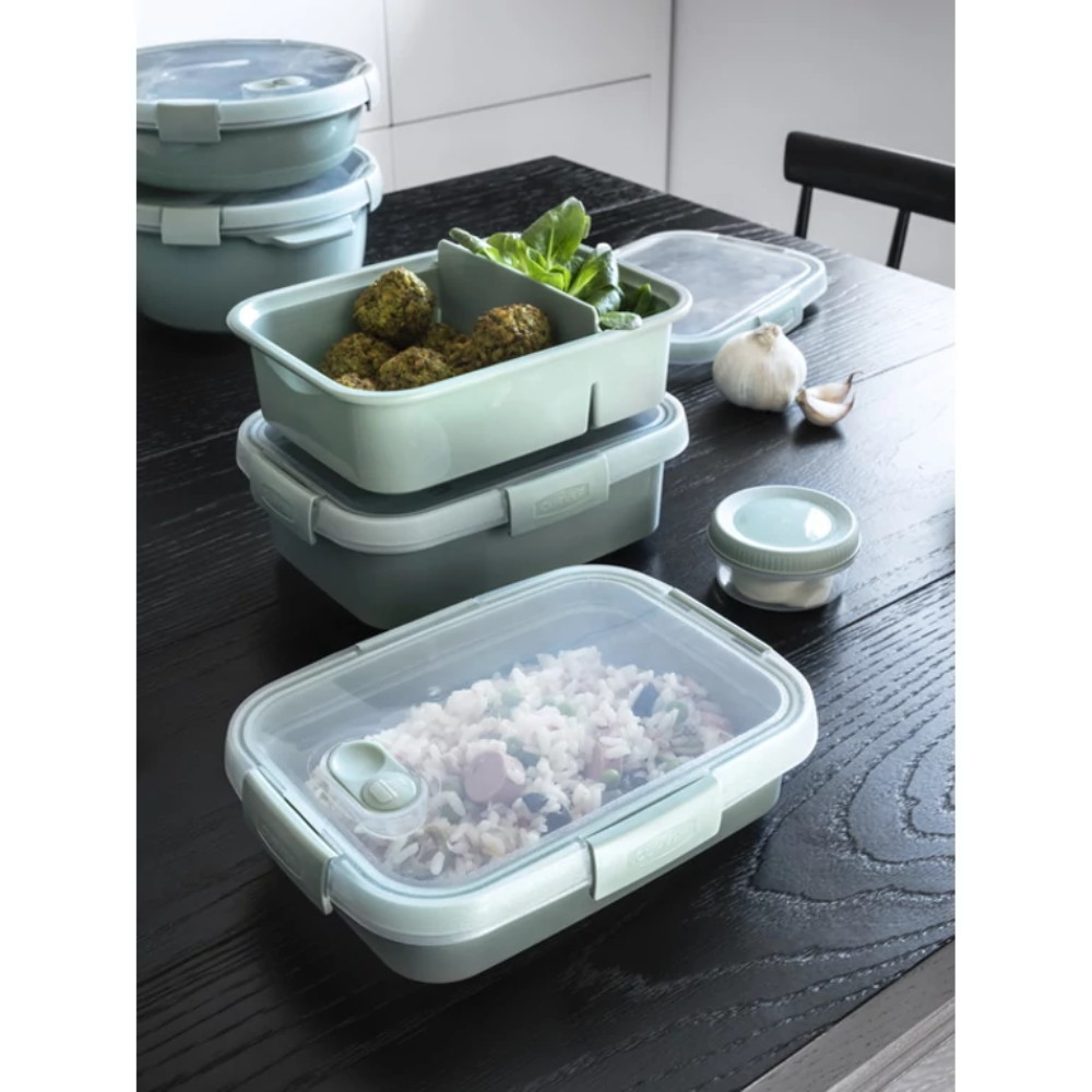 A Smart To Go Eco termékcsalád 0,7L-es téglalap alakú ételtartója mindenki számára tökéletes választás, aki értékeli a kényelmes és praktikus megoldásokat. Speciális tömítésének és szorosan záródó fedelének köszönhetően a benne tárolt élelmiszer hosszú ideig friss marad. A tetőn található egy speciális szelep is, melynek kinyitása után akár fedéllel együtt is melegíthető. További előnye a terméknek, hogy mosogatógépben mosható, valamint mikrohullámú sütőbe, hűtőszekrénybe és fagyasztóba is tehető. Egymásba tehetők, így helytakarékosan tárolhatók. 100%-ban újrahasznosított polipropilénből készül a termék, amely BPA mentes és élelmiszerrel való érintkezésre feljogosító tanúsítvánnyal is rendelkezik.