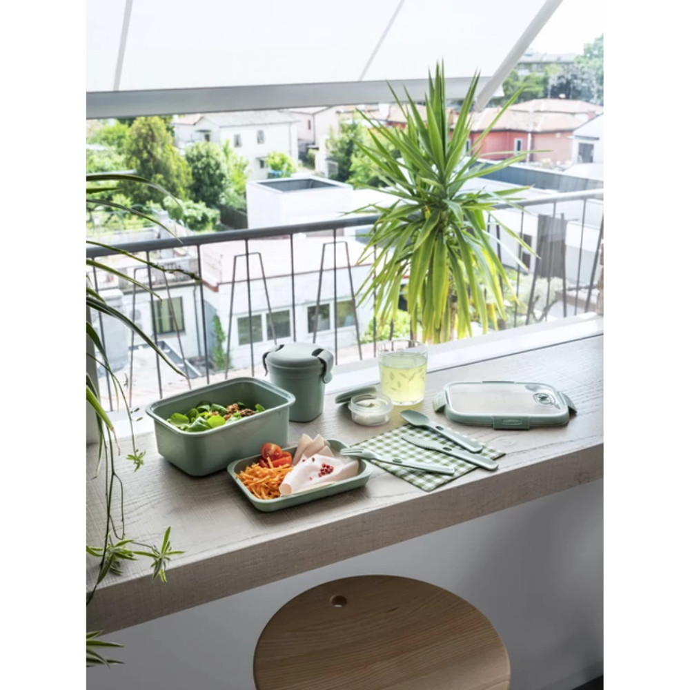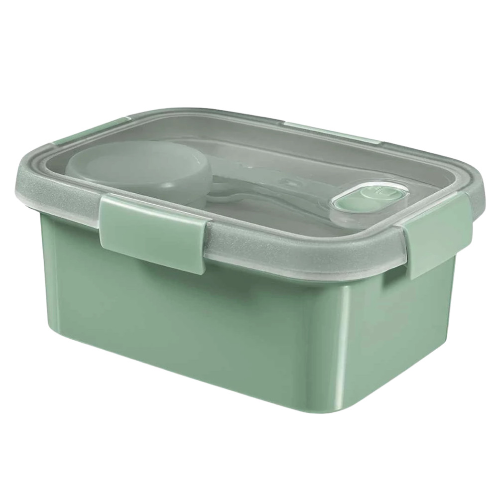 A Smart To Go Eco termékcsalád 1,2L-es téglalap alakú ételtartója mindenki számára tökéletes választás, aki értékeli a kényelmes és praktikus megoldásokat. A tetőben található tömítésnek és a szoros záródásnak köszönhetően a benne tárolt termékek hosszú ideig frissek maradnak. A fedelén szelep is található, melynek kinyitása után akár tetővel együtt is melegíthető az ételtartó. További előnyei a terméknek, hogy mosogatógépben mosható, valamint hűtőszekrényben és fagyasztóban is tárolható. Az ételtároló tartozéka még egy kis méretű tálca, egy 0,15L-es szószos pohár, valamint egy evőeszközkészlet is. Egymásba tehetők, így helytakarékosan tárolhatók. 100%-ban újrahasznosított polipropilénből készül a termék, amely BPA mentes és élelmiszerrel való érintkezésre feljogosító tanúsítvánnyal is rendelkezik.