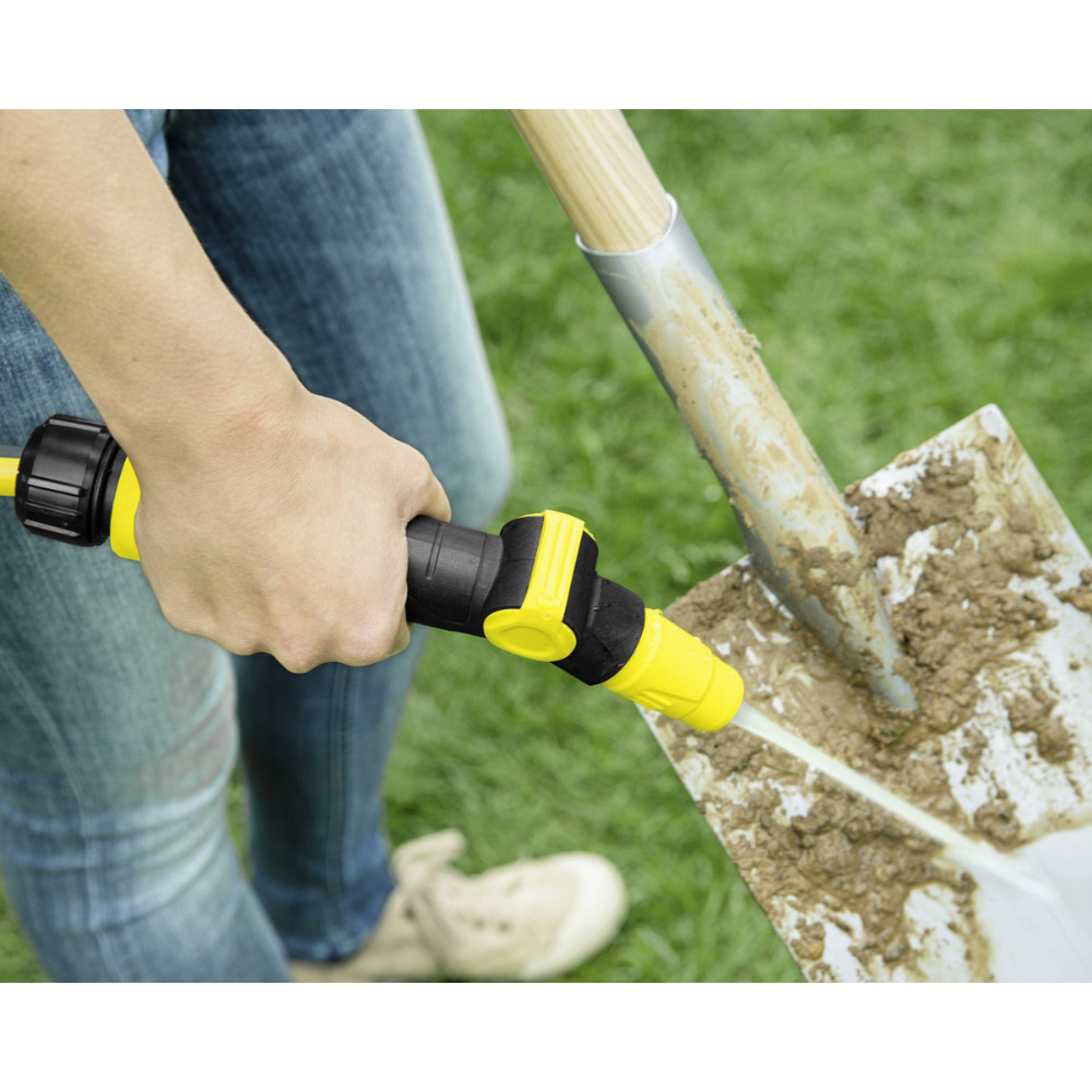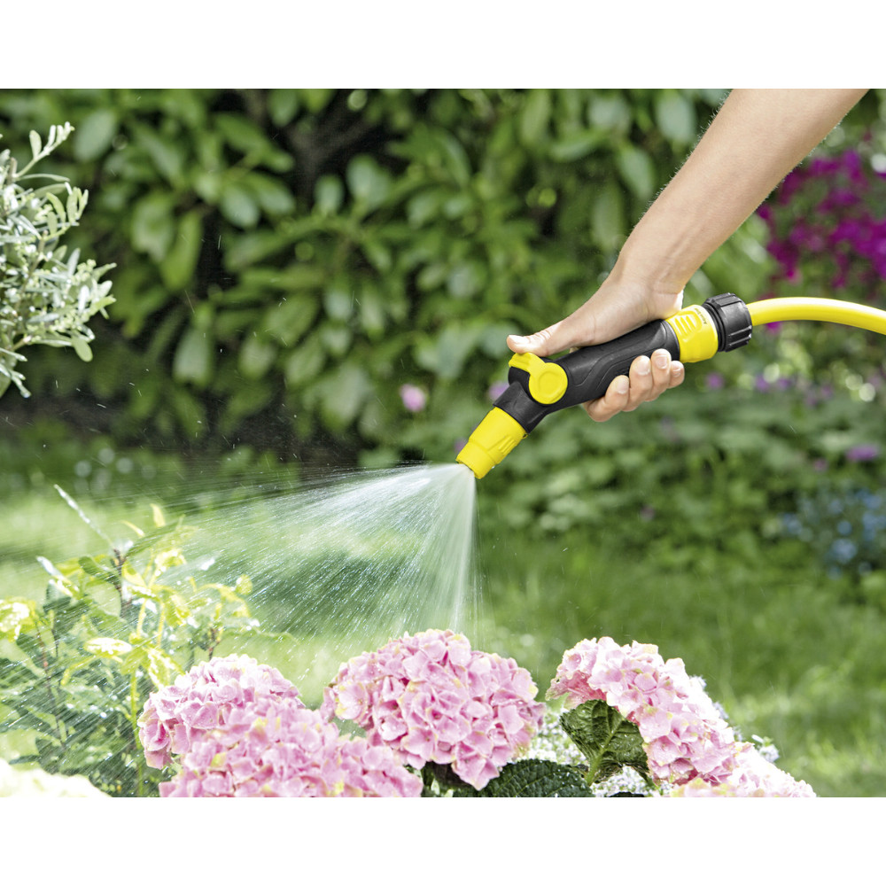 A szabályozható szórófej egy kézzel kezelhető szabályzószeleppel rendelkezik, amellyel a vízmennyiséget a kezelő a hüvelykujjával egyszerűen beállíthatja. Továbbá a kerti szórófejen 2 permetkép szükség szerint fokozatmentesen beállítható: pont- és kúpsugár. Így a virág- és növényágyások egyszerűen öntözhetők, de a teraszokról és kerti bútorokról is eltávolítható a szennyeződés. Emiatt a szabályozható szórófej kiválóan alkalmas öntözési és tisztítási feladatok elvégzésére is. Ha nem használja a vizet, akkor a szabályzószelepen elzárható. Egyébként a Kärcher szórófejei minden kapható csatlakoztató rendszerrel gond nélkül ráköthetők a kerti tömlőre.
