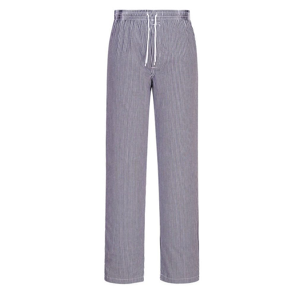 A Portwest C079 Bromley séfnadrág a klasszikus fekete-fehér kockás mintázatával ideális választás professzionális konyhai környezetbe.