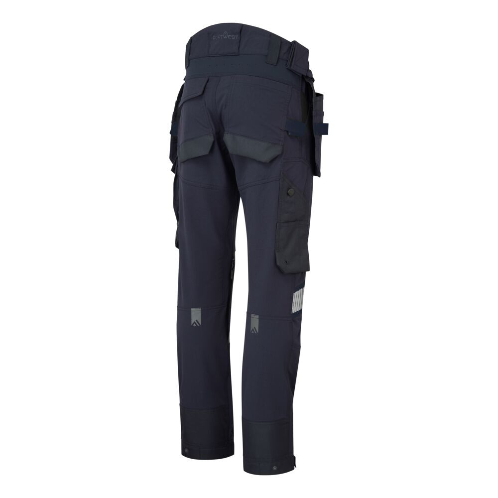 A funkcionalitás jegyében a nadrágot számos praktikus zsebbel látták el. A levehető, cipzáras lengőzsebek ideálisak a szerszámok és kisebb alkatrészek tárolására, míg a nagyméretű oldalsó zsebek, a vonalzótartó és a telefontartó zseb további tárolási lehetőségeket kínálnak. A kritikus pontokon, például a térd- és combrészen elhelyezett megerősítések növelik a nadrág élettartamát és kopásállóságát.