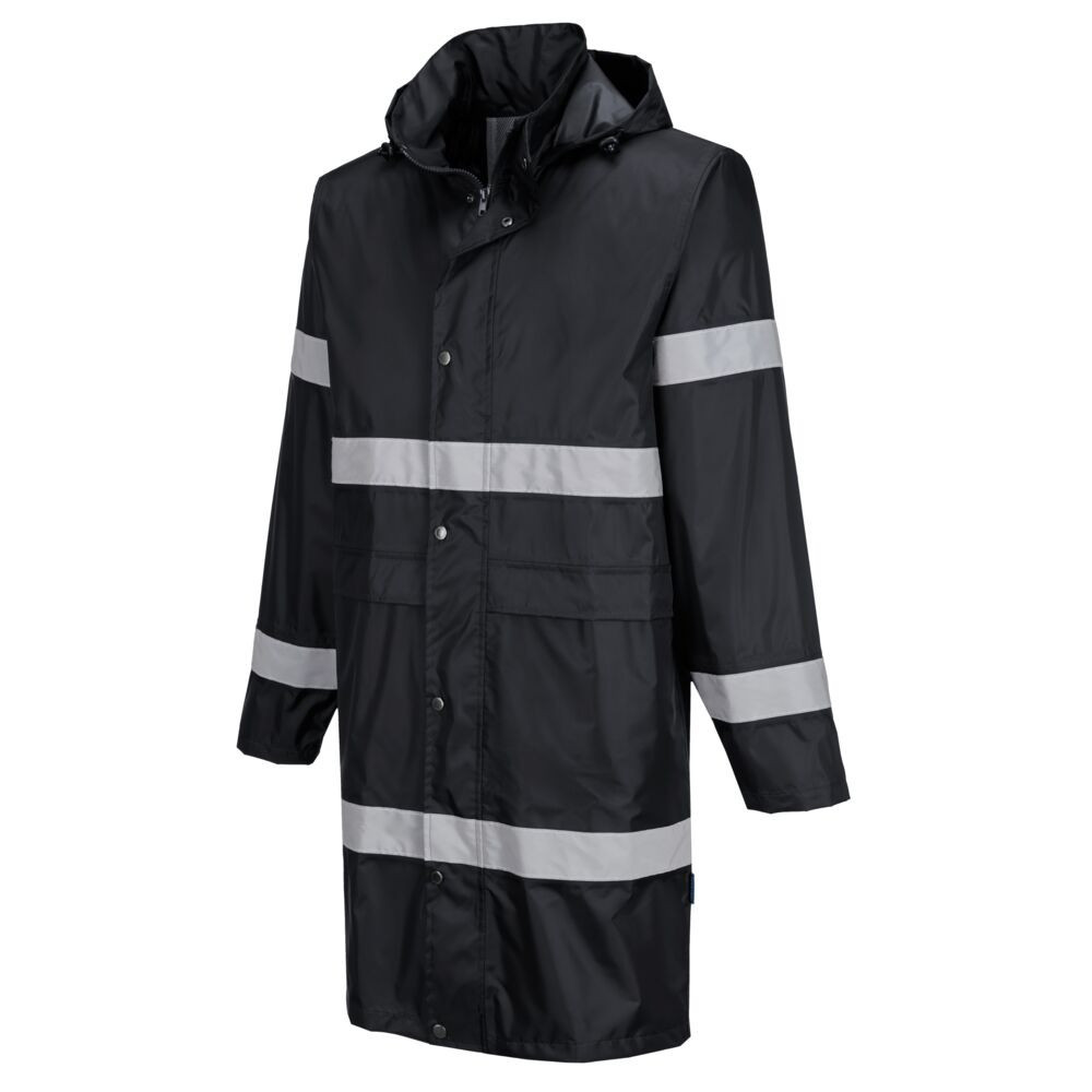 A Portwest F437 Iona egy 100 cm hosszú esőkabát, amely kiváló védelmet nyújt a zord időjárás ellen.