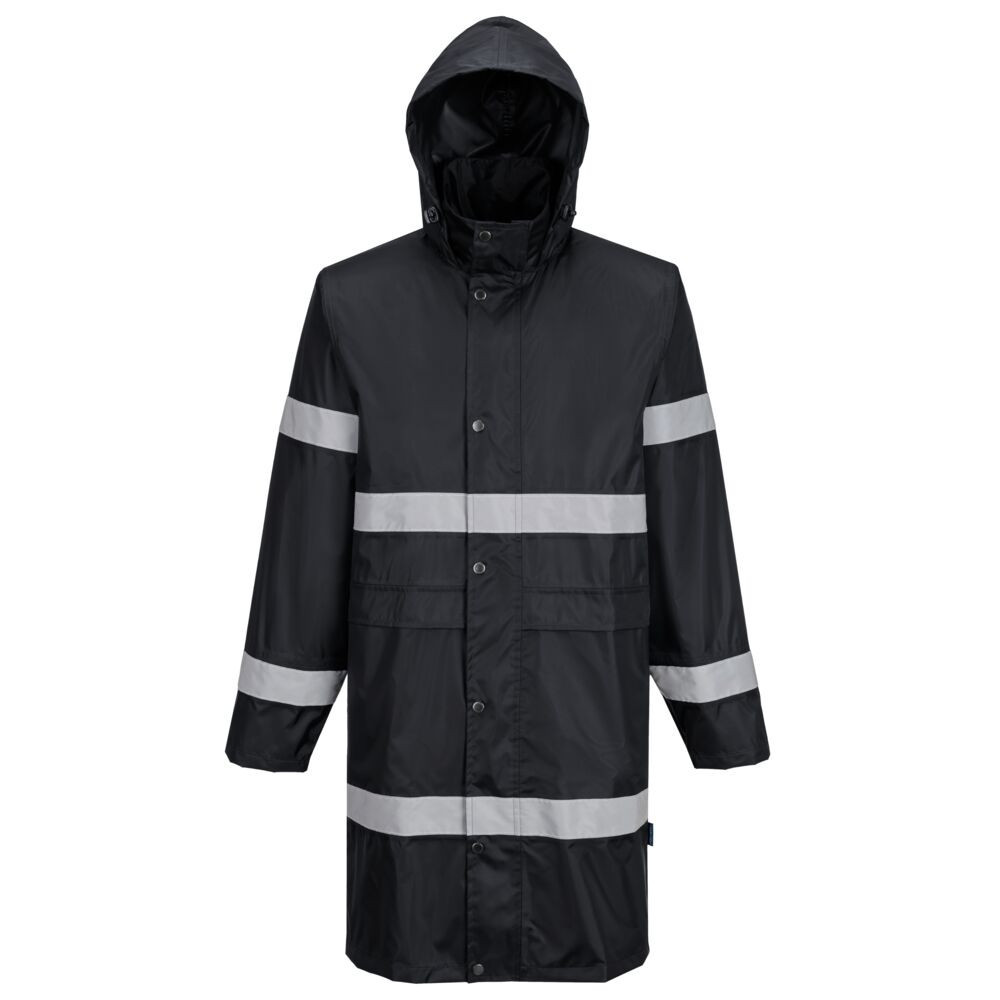 A Portwest F437 Iona egy 100 cm hosszú esőkabát, amely kiváló védelmet nyújt a zord időjárás ellen.