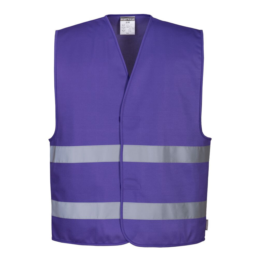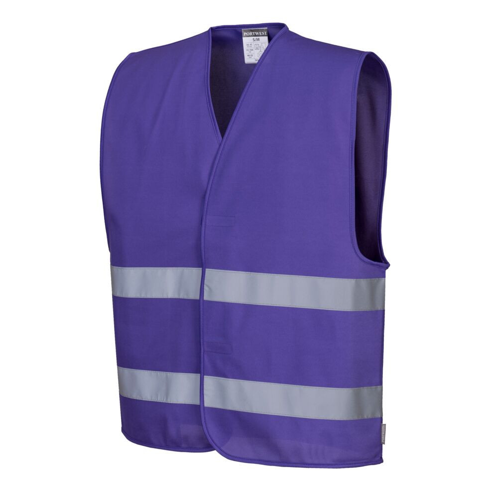 Fontos megjegyezni, hogy ez a termék a lila színe miatt nem felel meg a jól láthatósági ruházatra vonatkozó EN ISO 20471 szabványnak a háttéranyag tekintetében. A mellény elsődleges célja a láthatóság fokozása a rajta elhelyezett, tanúsított minőségű fényvisszaverő szalagok segítségével, nem pedig a szabvány szerinti teljes körű védelem biztosítása. A Portwest F474 termékcsalád sárga és narancssárga színű változatai rendelkeznek a megfelelő EN ISO 20471 tanúsítvánnyal.