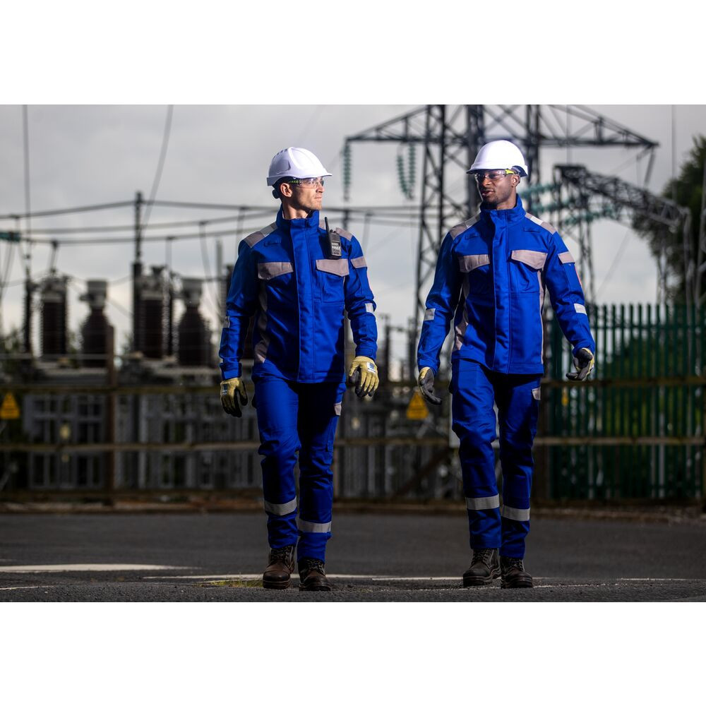 A prémium minőségű, kéttónusú királykék dizájn lángálló fényvisszaverő szalagokkal garantálja a maximális láthatóságot és a professzionális megjelenést.