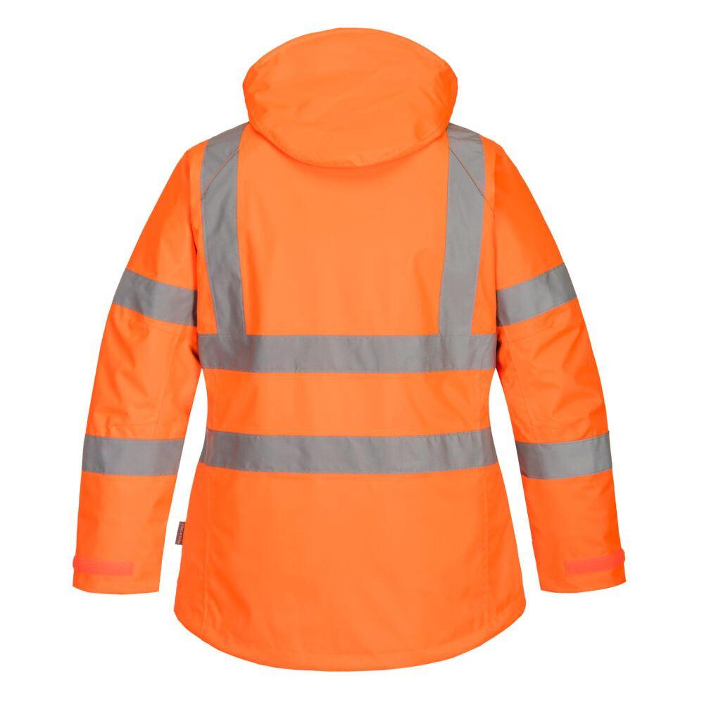 Vízálló, bélelt kialakítása és a tanúsított láthatósági tulajdonságok garantálják a biztonságos munkavégzést anélkül, hogy le kellene mondani a nőies, karcsúsított szabásról.