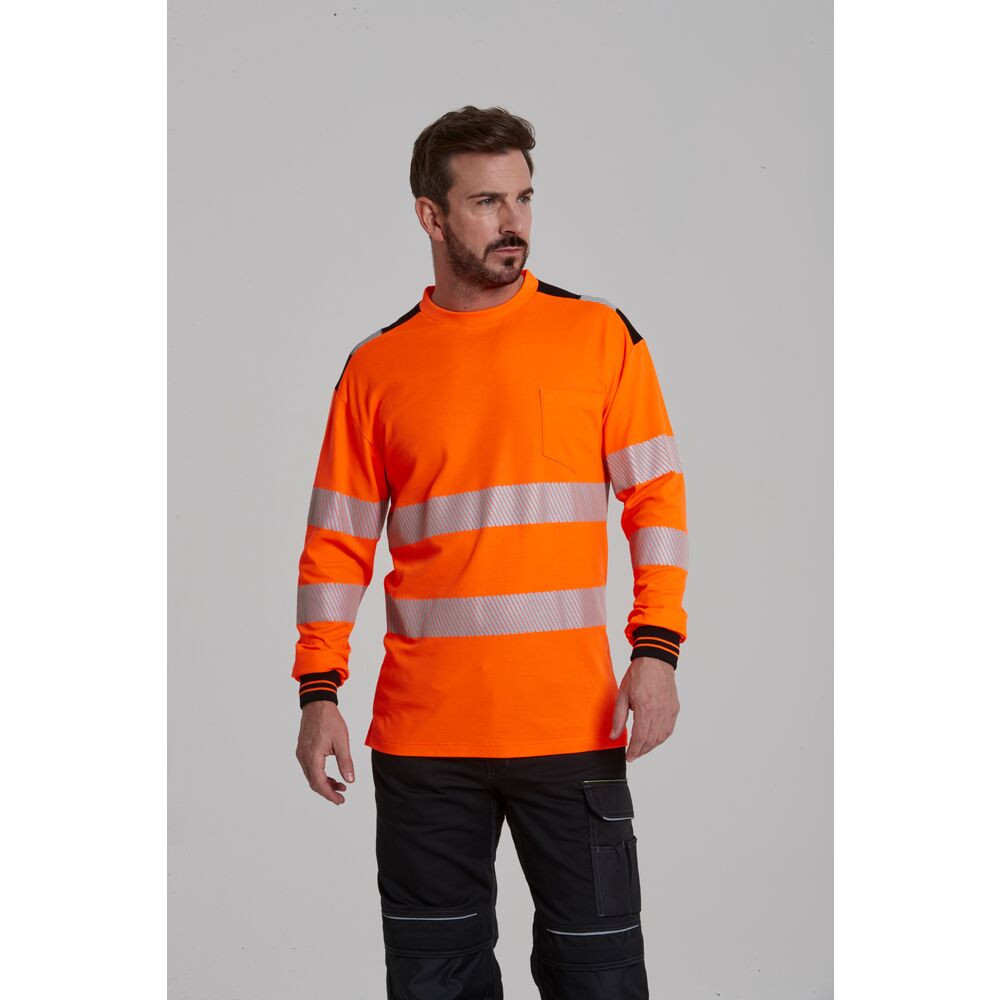 A maximális láthatóságot a könnyű és rugalmas HiVisTex Pro szegmentált hőillesztett fényvisszaverő szalagok biztosítják. Ezek a szalagok nem korlátozzák a mozgást és növelik a légáteresztő képességet a hagyományos varrott szalagokkal szemben. A póló modern, testhezálló (slim fit) szabása és a stílusos fekete kontrasztpanelek nemcsak esztétikus megjelenést kölcsönöznek, hanem a ruhadarab alsó részét is megvédik a szennyeződésektől.