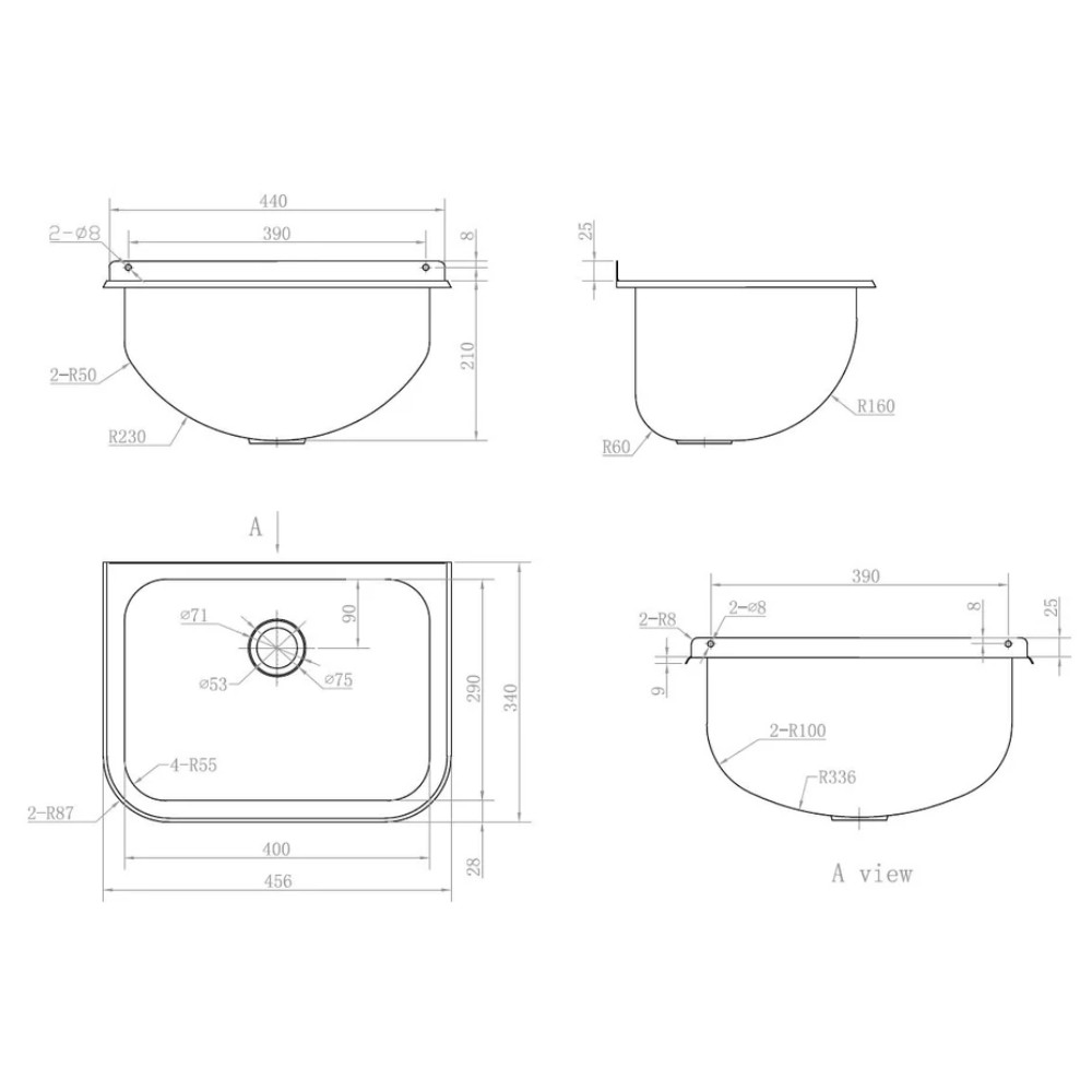 AISI304-es rozsdamentes acéllemezből mélyhúzott fali kiöntő, falikút kóracél ráccsal, hátlappal, leeresztőszeleppel, szifon nélkül.