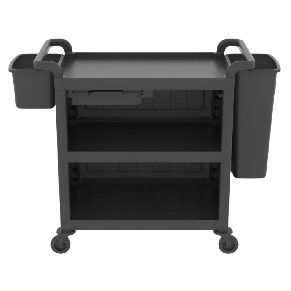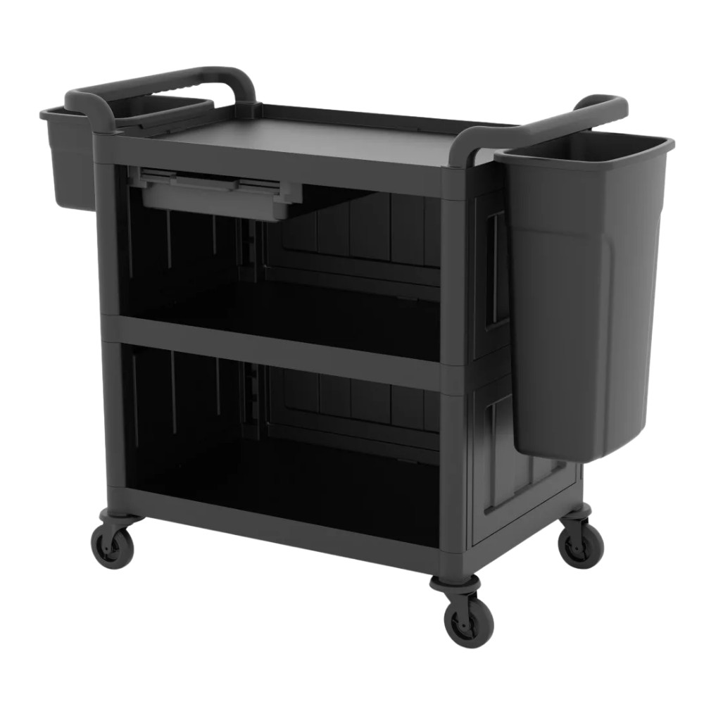 A félig zárt szervizkocsi két tárolóval multifunkcionális megoldás szállodák, éttermek és rendezvényhelyszínek számára. Tartós műanyag szerkezete biztosítja a hosszú élettartamot, a könnyen tisztítható felület pedig higiénikus használatot garantál.