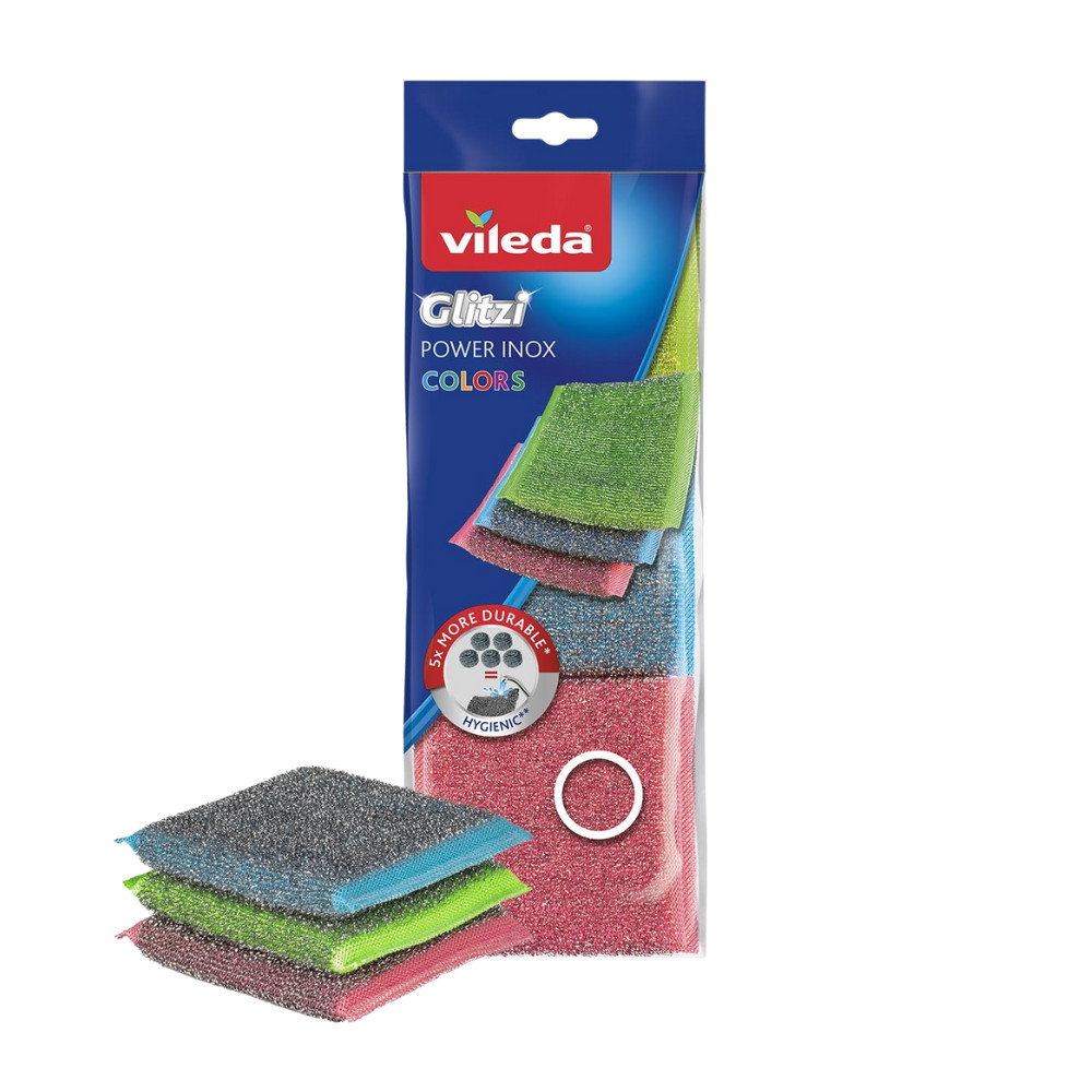 A Vileda Glitzi Power Inox Colors egy rozsdamentes acélhurkokból készült, színes súrolószivacs, amely hatékonyan távolítja el a makacs szennyeződéseket és odaégett ételmaradványokat edényekről, serpenyőkről és sütőkről. Puha szivacsmagja kényelmes fogást biztosít, könnyen öblíthető, higiénikusabb és ötször tartósabb, mint a hagyományos acél súrolók.